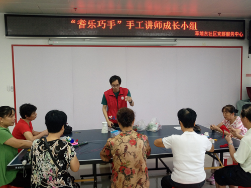 小组共计7节,截至今日已开展5节。小组前期的内容主要是订立小组契约,通过互动游戏消除组员的陌生感,增强组员的丝网花手工技能的熟练度和学习讲师的开场技巧。老人在手工小组中一起学习,相互协助。通过创意发挥,用双手变出一朵朵美丽的丝网花。小组中期主要是带领组员学习讲师的技巧,包括:授课前的准备工作;表达技巧;教学技巧和授课中会遇到问题与挑战。参与小组的老人表示:通过小组活动,让她们发展了兴趣,感受到参与小组所获得的成就感,晚年生活也因此变得更丰富多彩了。